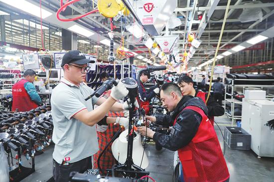 重庆台铃科技有限公司是台铃全国九大生产基地之一。这家从事电动自行车、电动摩托车、电动车、摩托车等研发生产的大型企业,2020年11月签约入驻大足高新区以来,带动凯隆祥、鑫亮、浩文轩、宇嘉、多普力等多家配套企业一同入驻,本地配套率已达80%以上。走进台铃公司生产车间,3条装配线马力全开,工人们精准地完成各项工序,一辆辆电动摩托车不断下线。“我们约600名职工全员复工复产,全力保证市场经销商车型需求。”公司总经理刘飞说。