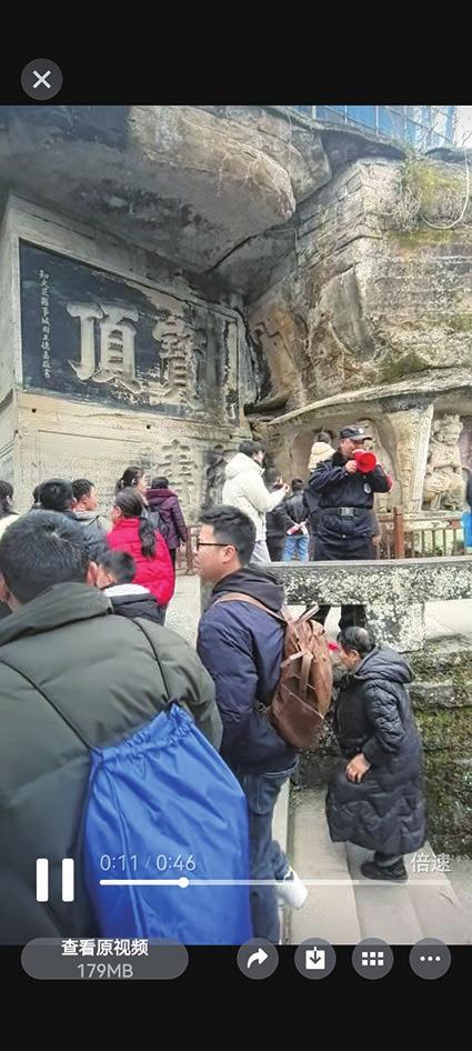不同于以往景区生硬的警示标语,邓刚的喊话接地气又有乐趣:“不管你是男客、女客、游客,来了都是大足石刻的客”“文物逗是老虎的屁股——摸不得”“爬梯梯,走坎坎,脚杆莫打闪闪”“堵路不堵心,要做客气的客,莫当生气的客”……诙谐的语气、真诚的提醒,让拥挤的现场多了欢声笑语。